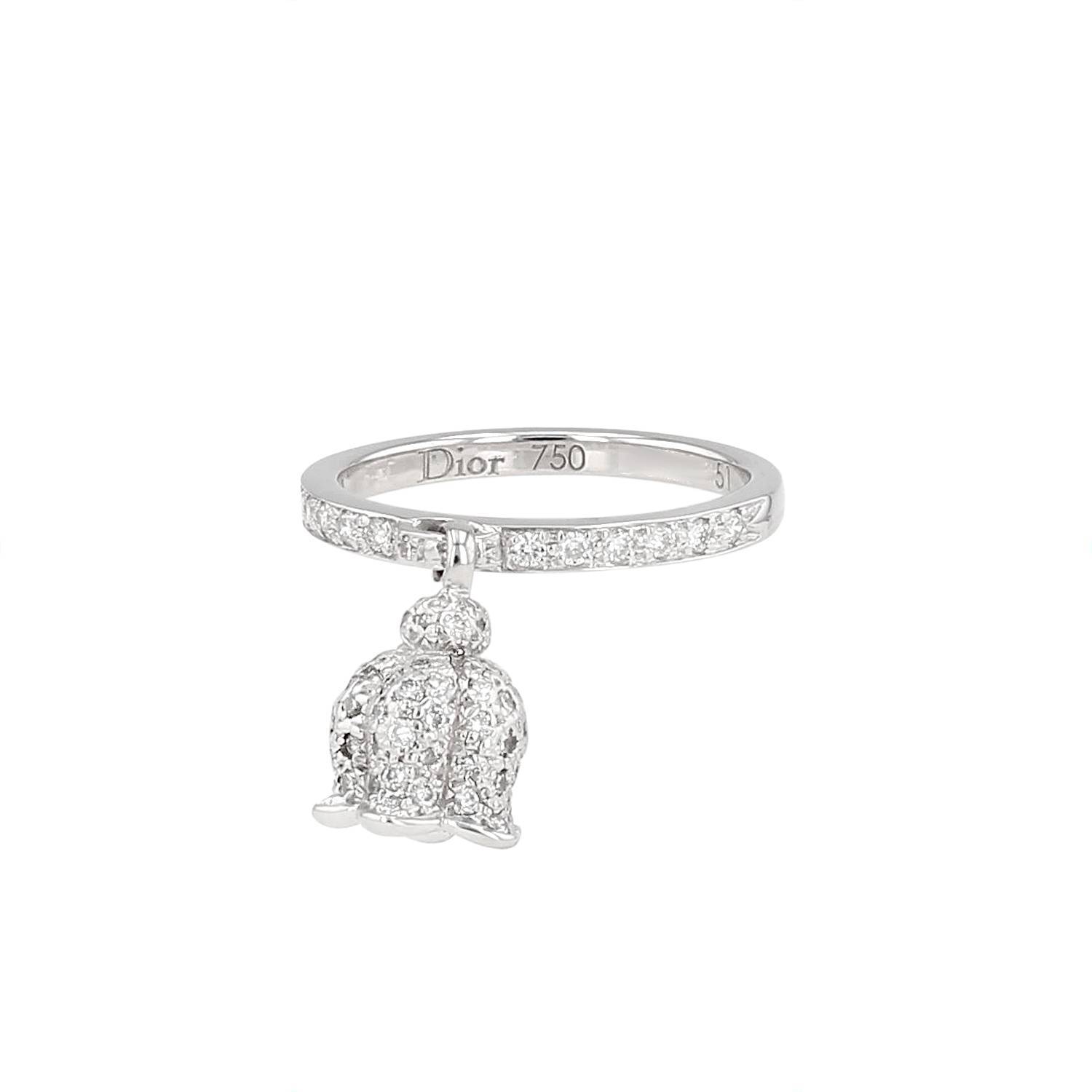Sortija Dior Muguet de oro blanco y diamantes, compuesta de un anillo de oro blanco delicadamente engastado de diamantes de talla brillante 0.15 quilate de de aproximadamente, adornada de una flor delicadamente pavimentada de diamantes de talla brillante.