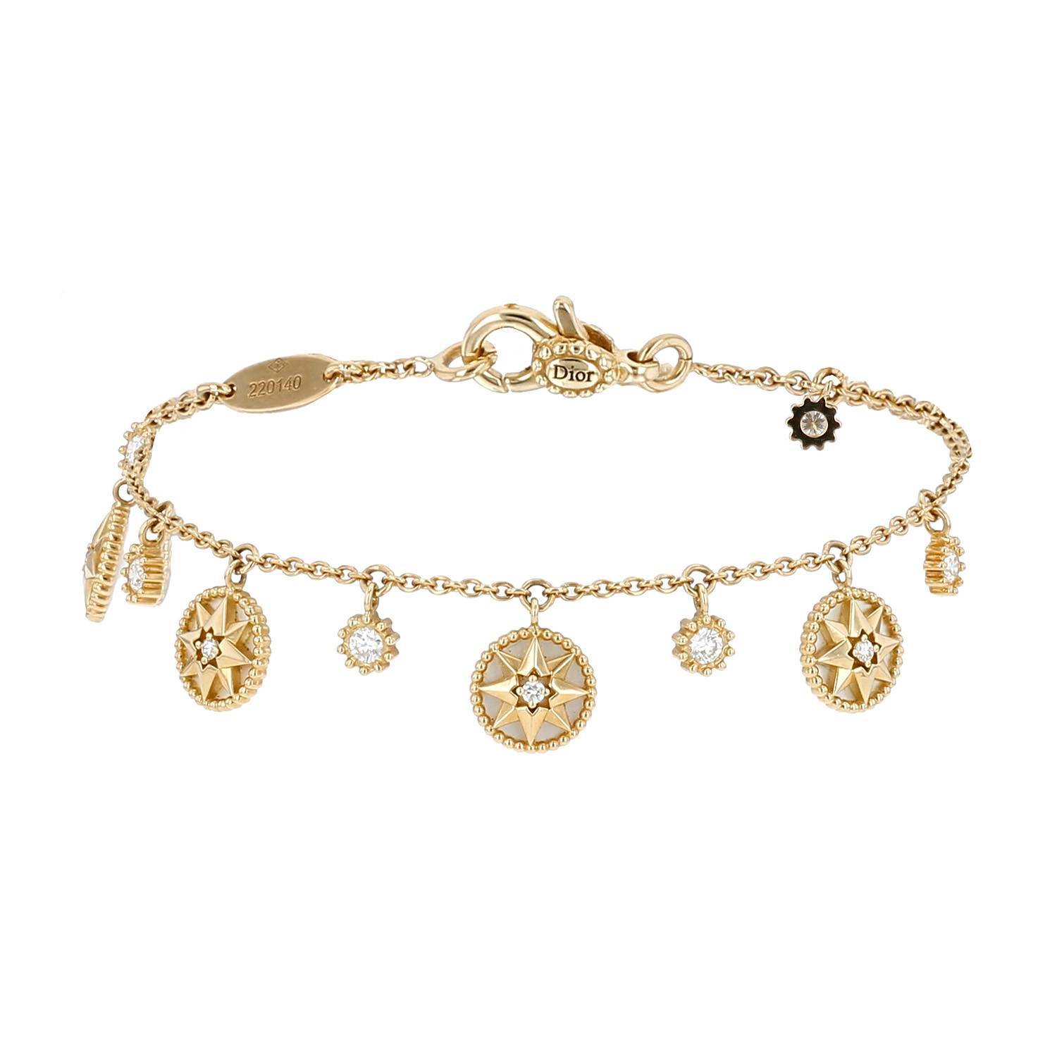 Brazalete Dior Rose des vents de oro amarillo, de nácar, y en diamantes, compuesto de preciosos discos abombados de nácar, adornado de muy bonitas estrellas geométricas de oro amarillo delicadamente engastadas de diamantes de talla brillante realzadas de una borde adornado con perlas, realzado de pequeños diamantes de talla brillante engastados cerrados, sujetado por una delgada cadena de oro amarillo.