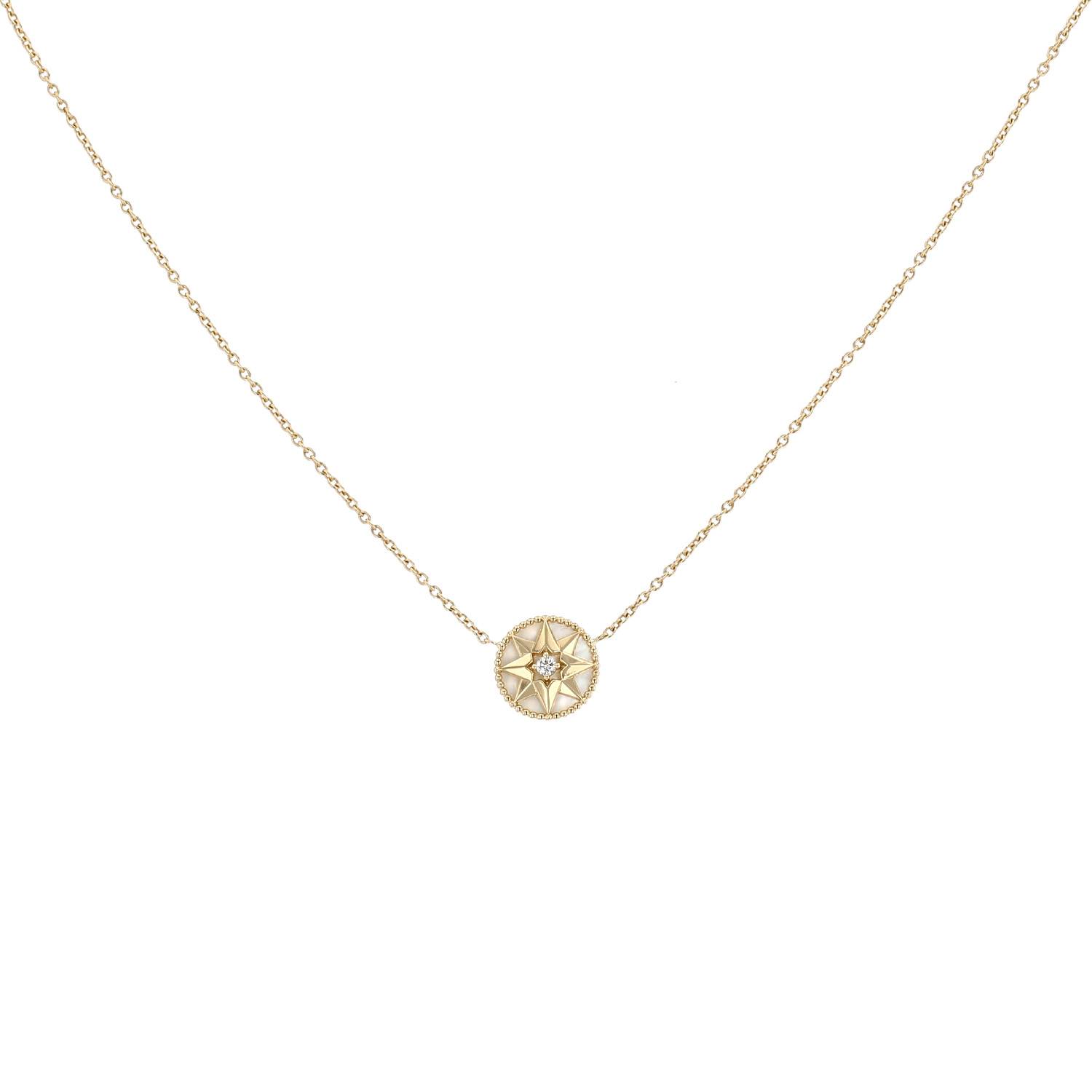 Collar Dior Rose des vents de oro amarillo, de nácar, y en diamante, compuesto de un precioso disco abombado de nácar, adornado de una muy bonita estrella geométrica de oro amarillo delicadamente engastada de un diamante de talla brillante de 0,04 quilate, realzado de una encantador borde adornado con perlas, sujetado por una delgada cadena de oro amarillo.