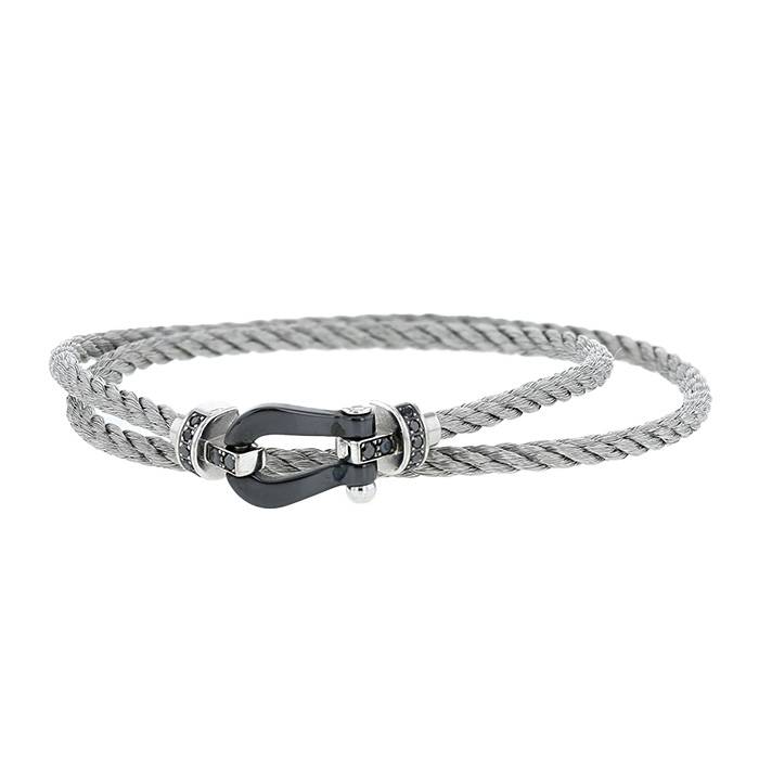 Brazalete Fred Force 10 mediano de oro blanco, de cerámica negra, y en diamantes negros, en el cual figura una elegante grillete geométrico de cerámica negra, de oro blanco elegantemente engastado de diamantes, realzado de un importante cable retorcido de acero, todo ello sujetado por un cable de acero.
