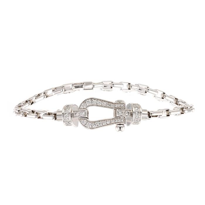 Intemporal brazalete Fred Force 10 mini de oro blanco y diamantes, en el cual figura un elegante grillete geométrico de oro blanco delicadamente engastado de diamantes, realzado de una bonita cadena de oro blanco.