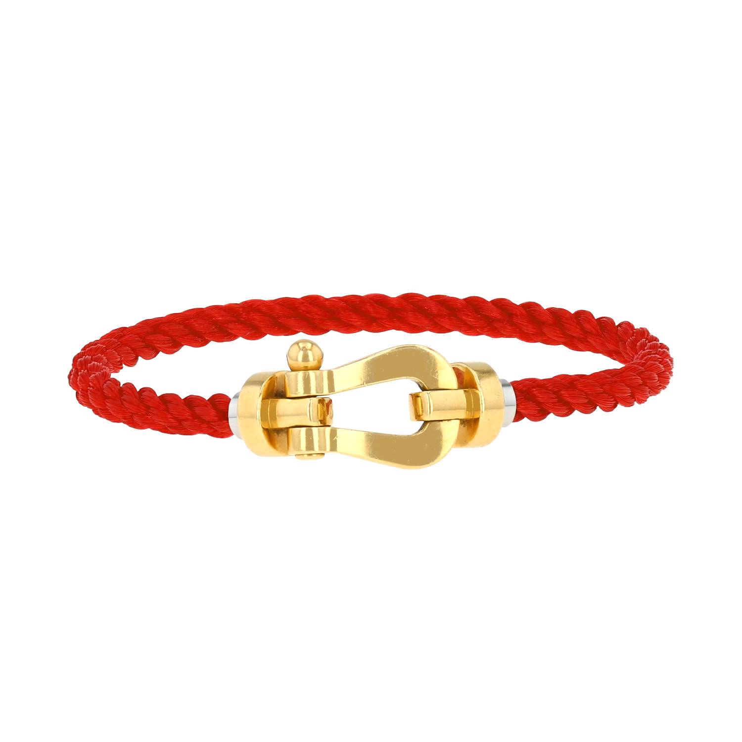 Brazalete Fred Force 10 modelo grande de oro amarillo y nylon, compuesto del intemporal grillete geométrico de oro amarillo, realzado de un bonito cable retorcido de nylon rojo.
