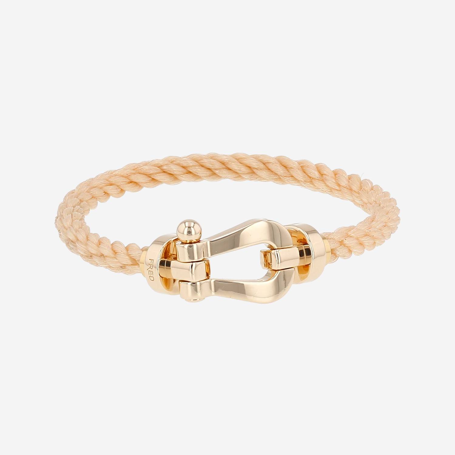 Brazalete Fred Force 10 modelo grande de oro amarillo y nylon, compuesto del intemporal grillete de oro amarillo, realzado de un cable retorcido de nylon beige.