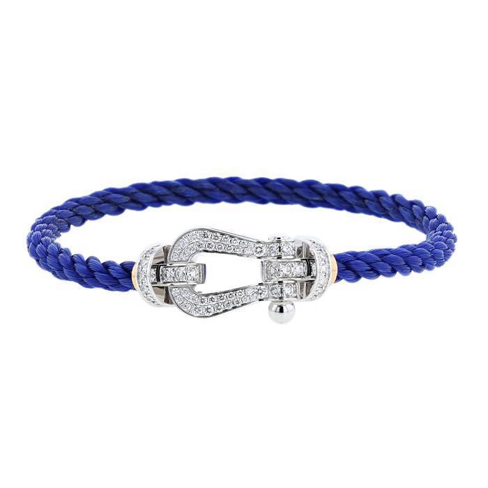 Brazalete Fred Force 10 modelo grande de oro blanco y diamantes, compuesto del intemporal grillete geométrico de oro blanco delicadamente pavimentado de diamantes de talla brillante 0.90 quilate de en total, todo ello acompañado de de un bonito cable retorcido de nylon azul marino.