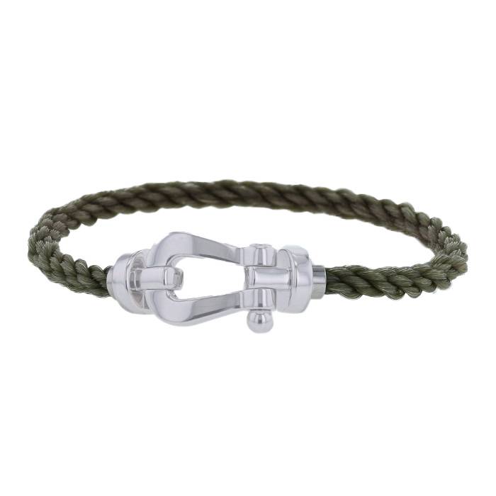 Brazalete Fred Force 10 modelo grande de oro blanco y nylon, en el cual figura una elegante grillete geométrico de oro blanco, realzado de un cables retorcidos de nylon gris.