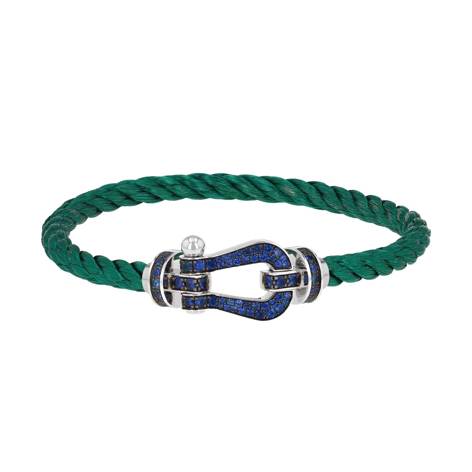Brazalete Fred Force 10 modelo grande de oro blanco, de zafiros, y en nylon, compuesto del intemporal grillete geométrico de oro blanco enteramente engastado de zafiros de talla redonda, realzado de un bonito cable retorcido de nylon verde.