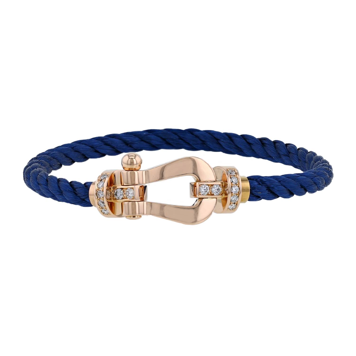 Brazalete Fred Force 10 modelo grande de oro rosa y diamantes, compuesto del intemporal grillete geométrico de oro rosa parcialmente engastado de diamantes de talla brillante de 0.28 quilate en total, sujetado por un bonito cable retorcido de acero.