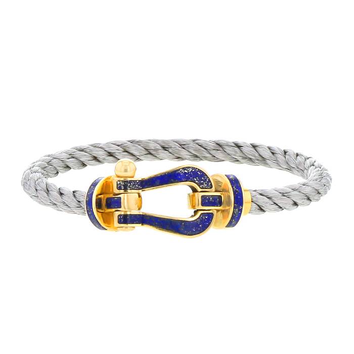 Magnífico brazalete Fred Force 10 modelo grande de oro amarillo, de acero y de lapislázuli, en el cual figura un elegante grillete geométrico de oro amarillo, adornado en la parte superior de lapislázuli, realzado de un importante cable retorcido de acero.