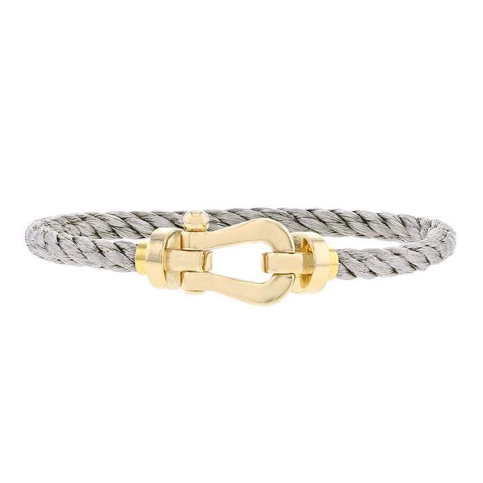 Intemporal brazalete Fred Force 10 modelo grande de oro amarillo y acero, en el cual figura un elegante grillete geométrico de oro amarillo, realzado de un importante cable retorcido de acero gris.