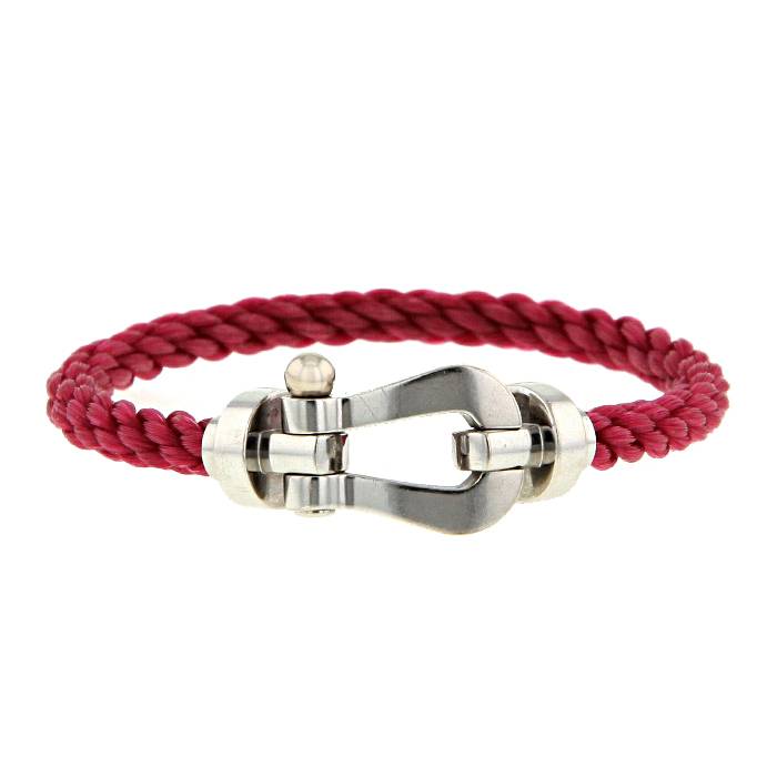 Intemporal brazalete Fred Force 10 modelo grande de oro blanco y nylon rosa, en el cual figura un elegante grillete geométrico de oro blanco, realzado de un importante cable retorcido de nylon rosa.
