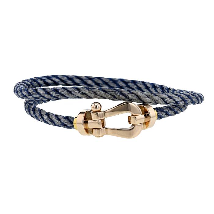 Intemporal brazalete Fred Force 10 modelo grande de oro rosa y acero, en el cual figura un elegante grillete geométrico de oro rosa, realzado de un importante cable retorcido de acero azul.