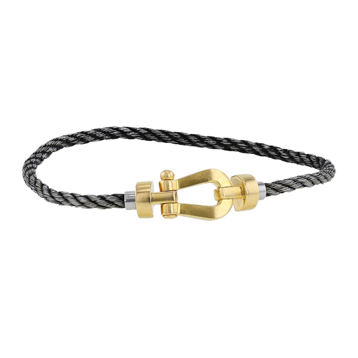 Brazalete Fred Force 10 modelo mediano de oro amarillo y acero, compuesto del intemporal grillete geométrico de oro amarillo, realzado de un cable retorcido de acero.