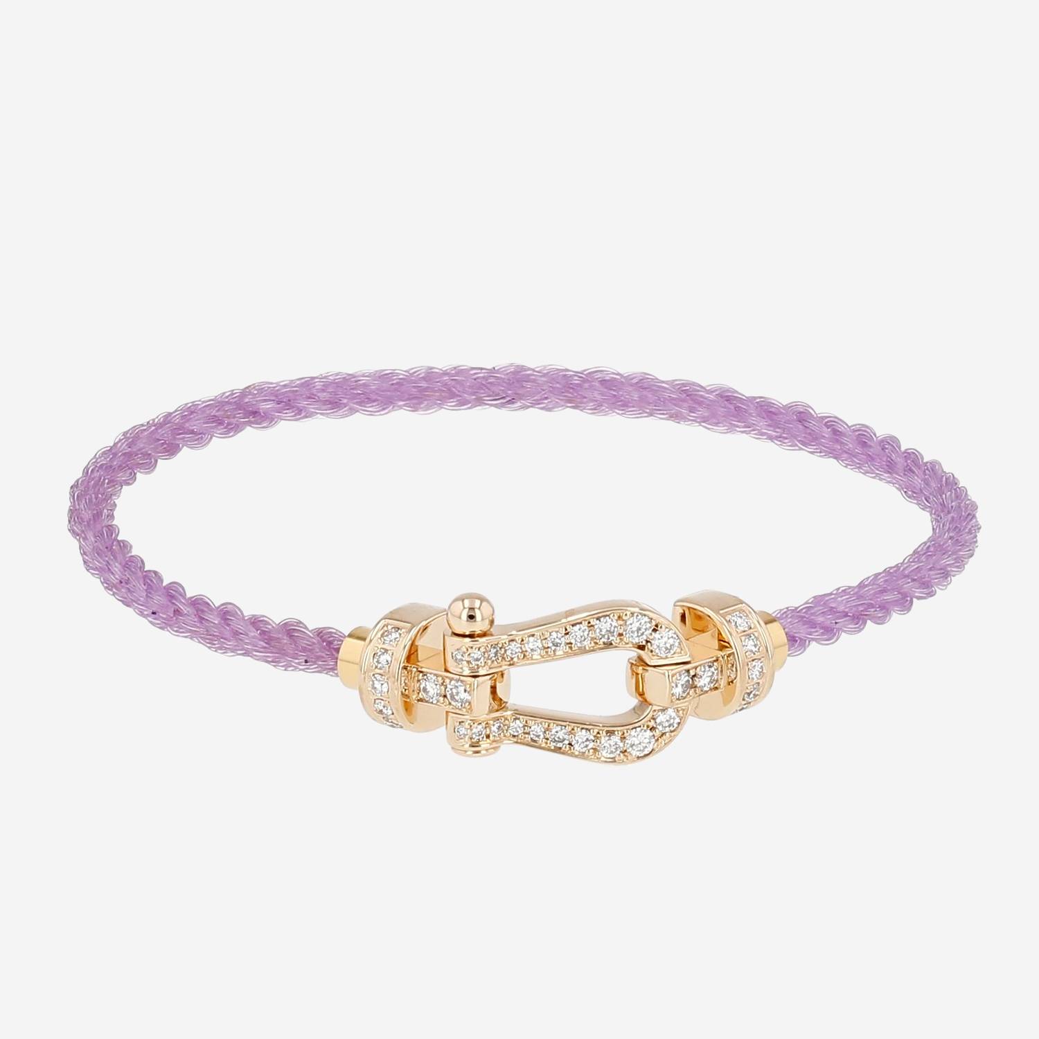 Brazalete Fred Force 10 modelo mediano de oro amarillo y diamantes, compuesto del intemporal grillete geométrico calado de oro amarillo enteramente pavimentado de diamantes de talla brillante 0.25 quilate de en total, realzado de un bonito cable retorcido de nylon color lila.