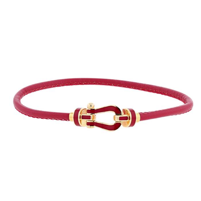 Brazalete Fred Force 10 modelo mediano de oro amarillo y esmalte rojo, compuesto de una inconfundible grillete geométrico de oro amarillo, de esmalte, realzado de un cable retorcido de cuero rojo.