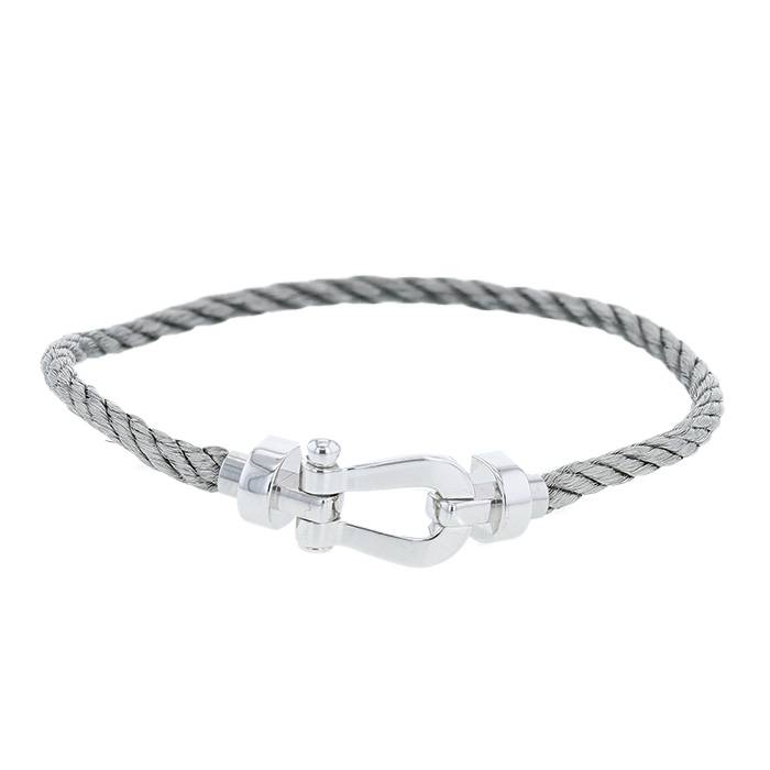 Intemporal brazalete Fred Force 10 modelo mediano de oro blanco y acero, en el cual figura una elegante grillete geométrico de oro blanco, realzado de un cable retorcido de acero.