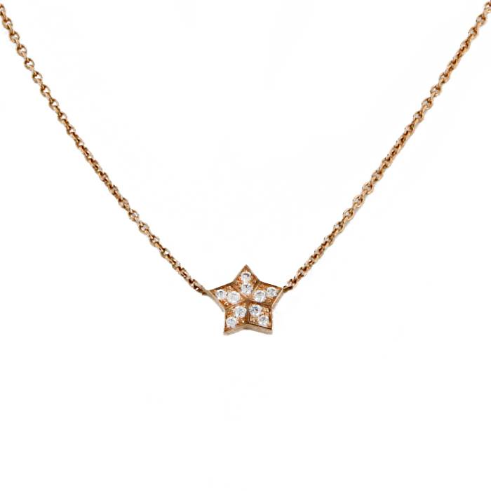 Precioso collar de la colección "Miss Fred Star" de oro rosa y diamantes, estilizando una delicada estrella geométrica enteramente pavimentada de diamantes de talla brillante, sujetado por una delgada cadena de oro rosa.