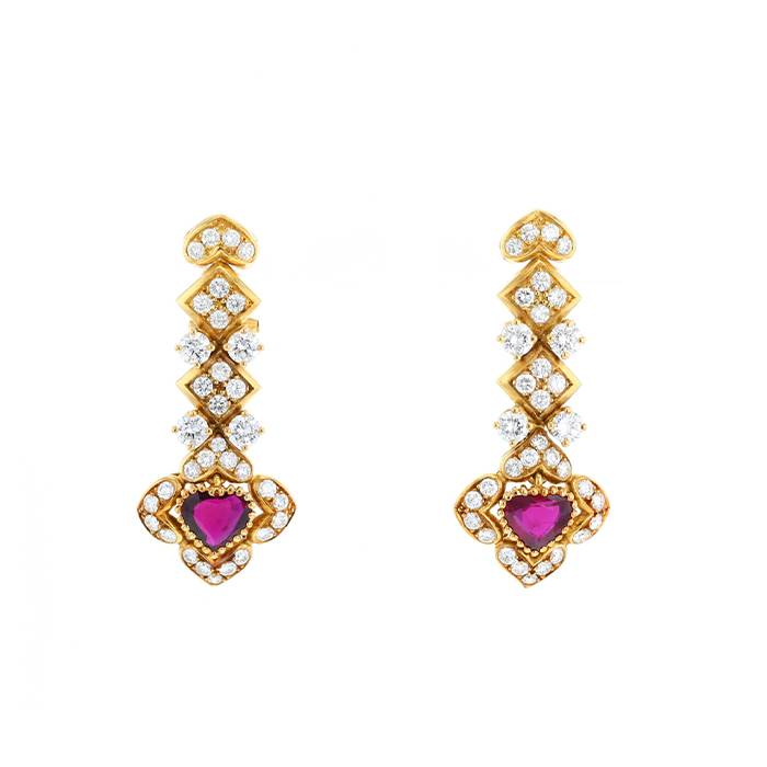 Pendientes Fred de oro amarillo, de diamantes, y en rubíes, compuestos de una elegante engaste articulado de oro amarillo delicadamente engastado de diamantes de talla brillante 2 quilates de de aproximadamente, adornados en el centro de preciosos colgantes engastados de rubíes de talla corazón realzados de una borde adornado con perlas.