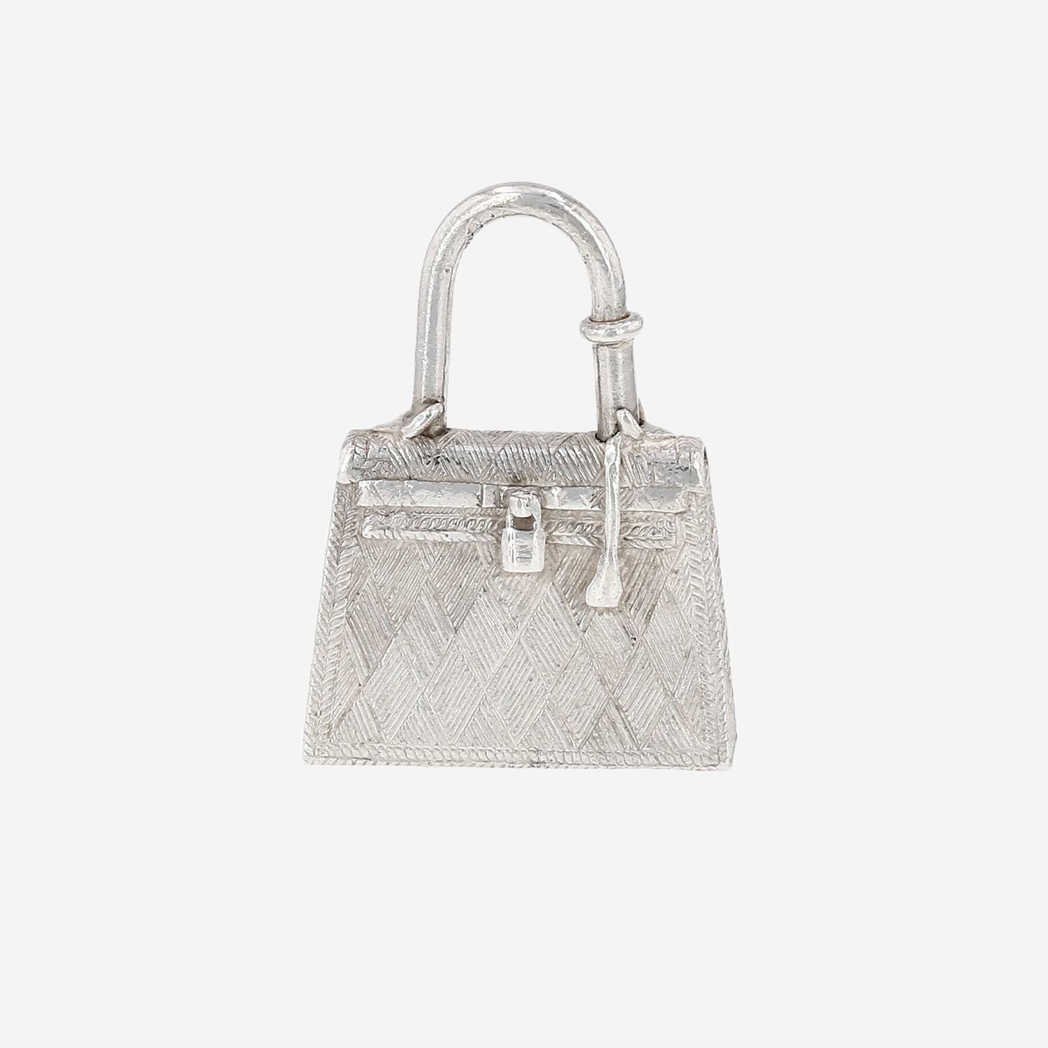 Codiciado candado Hermès Cadenas de plata, en el cual figura un divertido pequeño bolso Kelly de mano, adornado de motivos geométricos grabados.