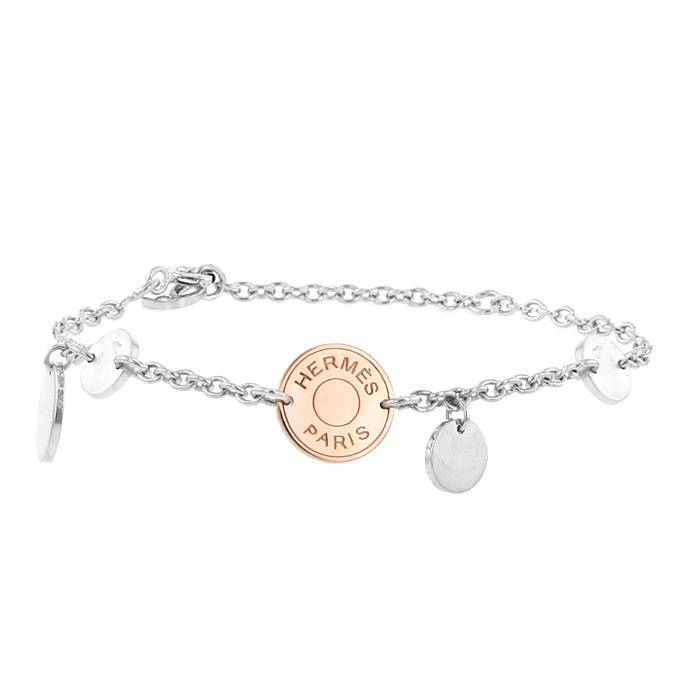 Elegante brazalete Hermes Confettis de plata y oro rosa, compuesto de una preciosa cadena de plata, adornado de una sucesión de motivos redondos, realzado de un bonito diseño redondo grabado de oro rosa "Hermès Paris".
