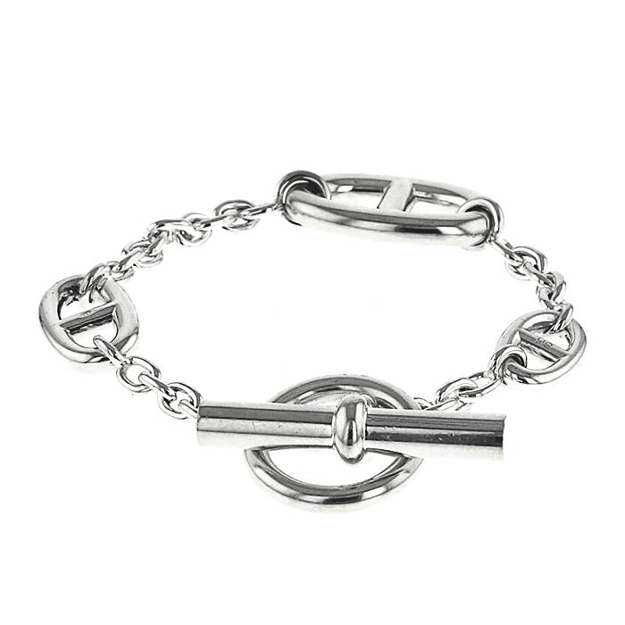 Encantador brazalete Hermès Farandole de plata, compuesto de una sucesión de 3 bonitos eslabones ovalados calados, sujetado por una bonita cadena de plata.