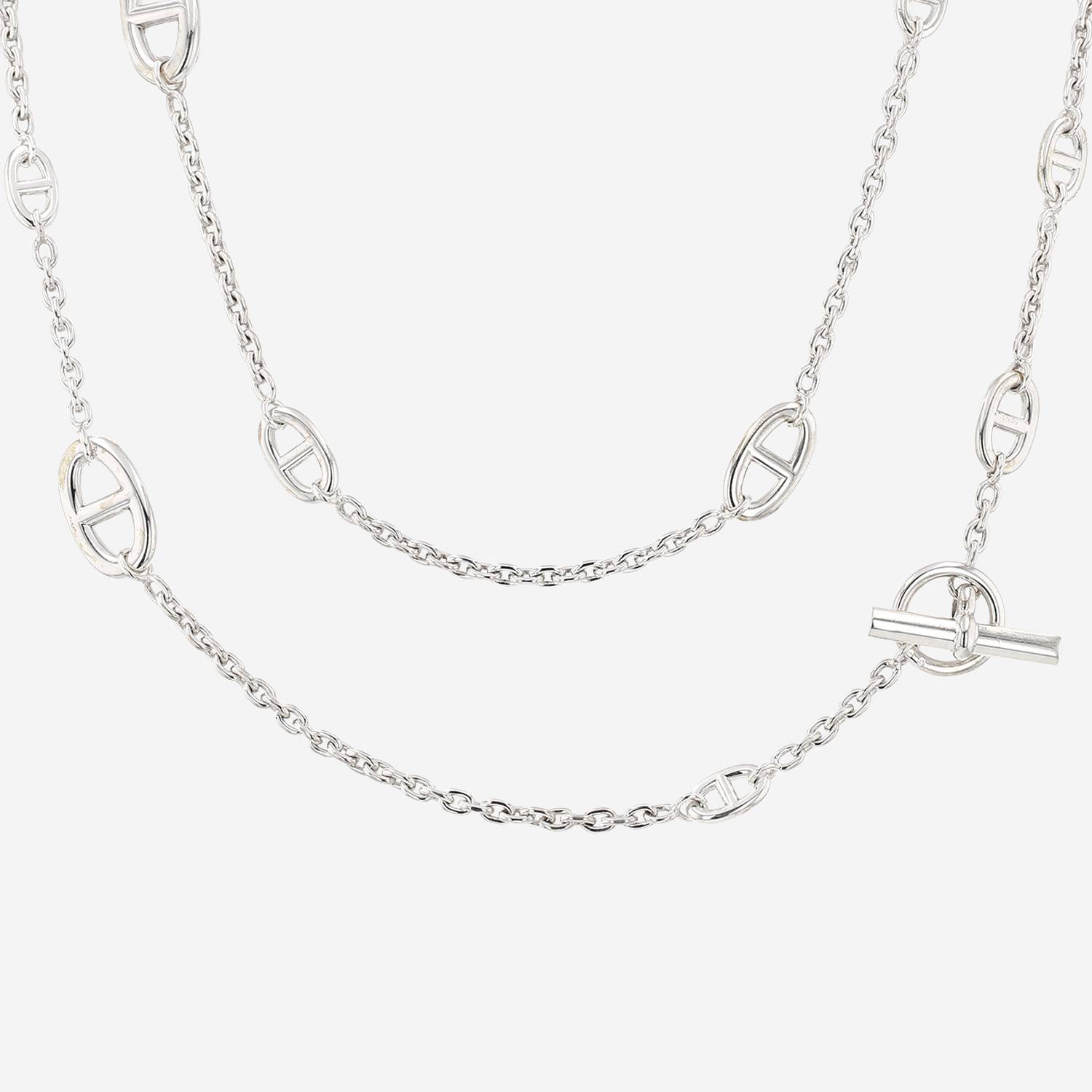 Magnífico collar Hermès Farandole 120 cm de plata, compuesto de una alternancia de bonitos eslabones ovalados calados de plata, sujetado por una cadena de eslabones redondos.