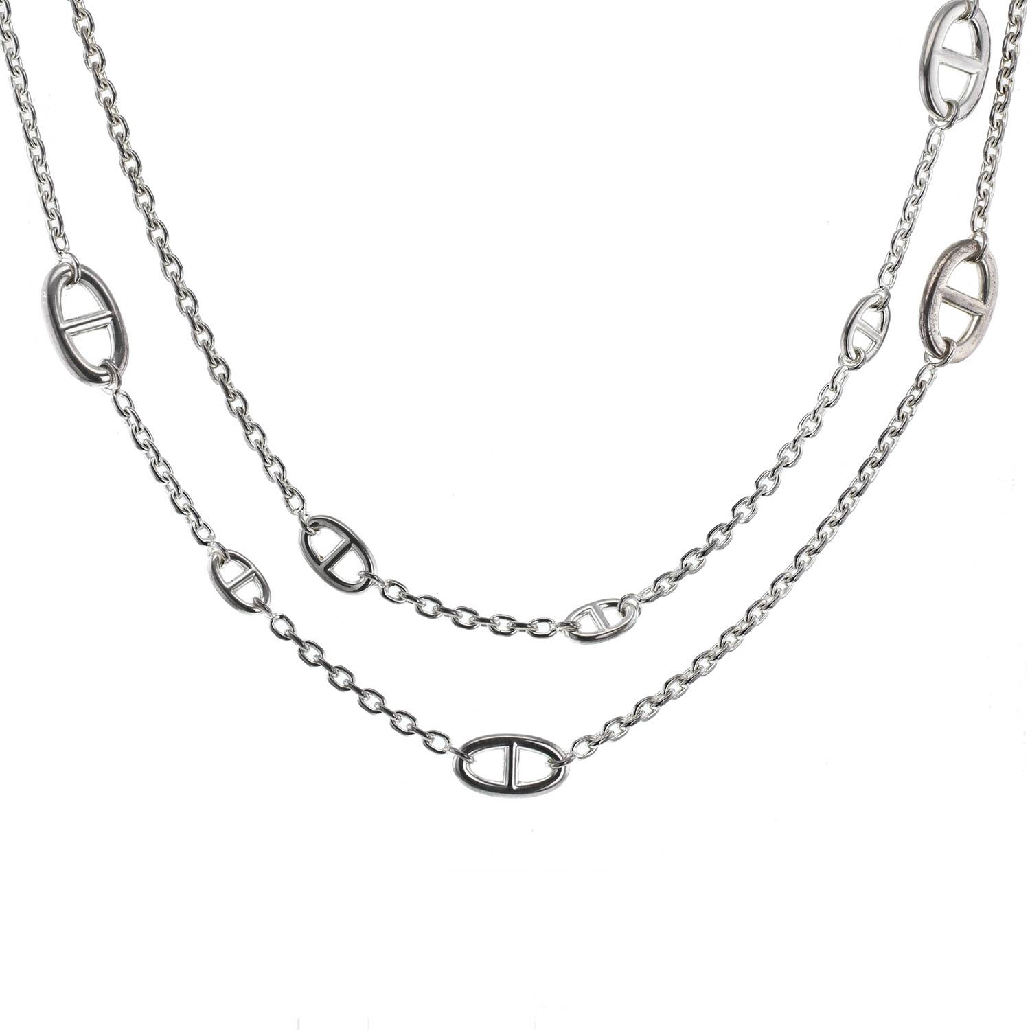 Magnífico collar Hermès Farandole de plata, compuesto de una alternancia de bonitos eslabones ovalados calados de plata, sujetado por una cadena de eslabones redondos.