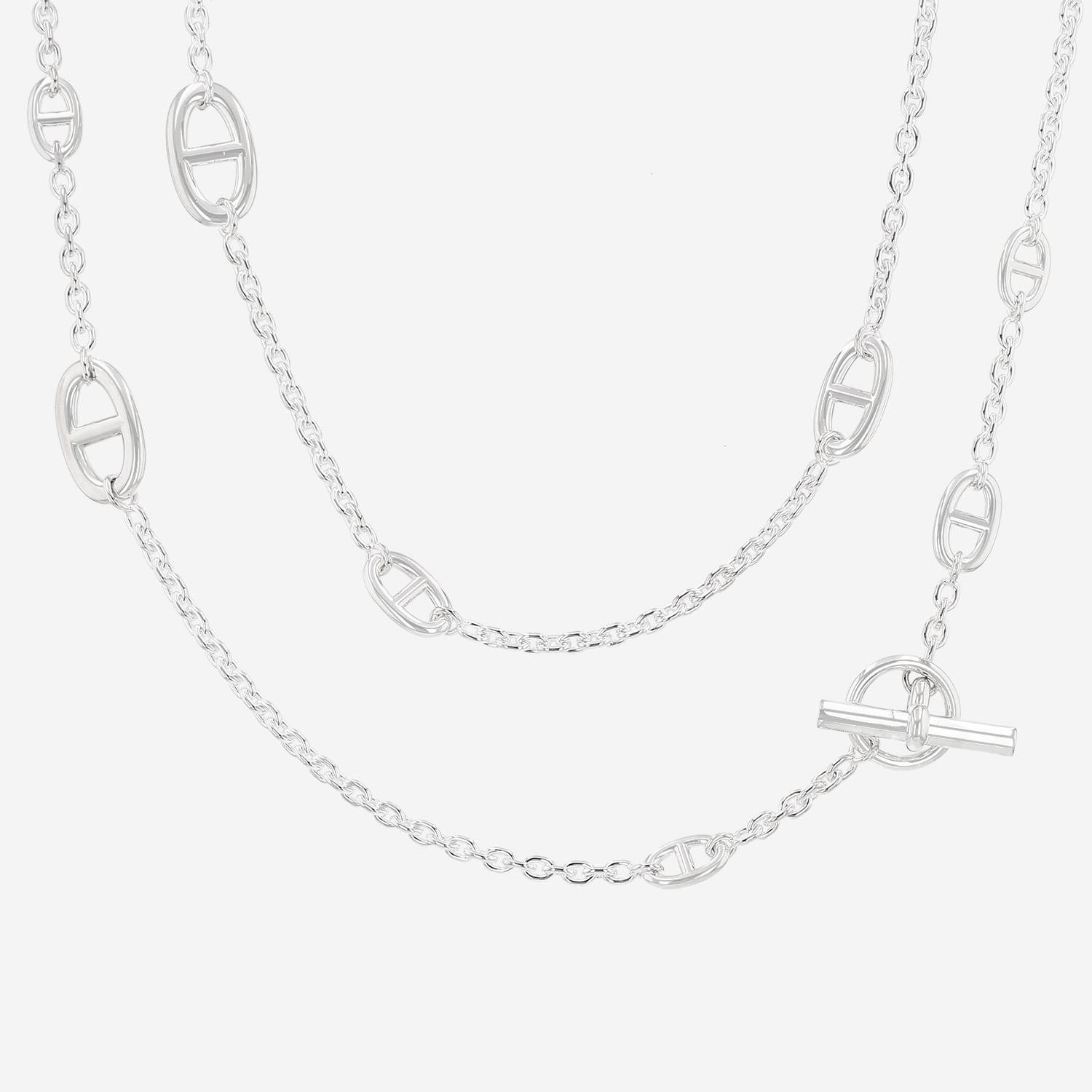 Magnífico collar Hermès Farandole de plata, compuesto de una alternancia de bonitos eslabones ovalados calados de plata, todo ello sujetado por cadena de eslabones encadenados de oro blanco.