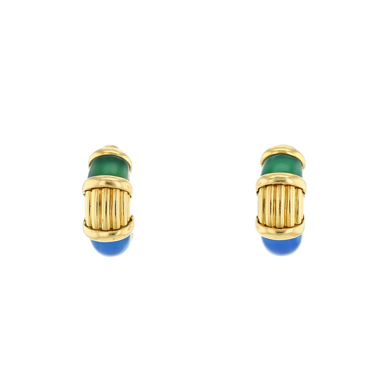 Pendientes Hermès de oro amarillo, de ágata, y en crisoprasa, compuestos de bonitos circulos gruesos de oro amarillo, adornados de cabujones de ágata azul y de crisoprasa, realzados en el centro de motivos gallonados de oro amarillo.