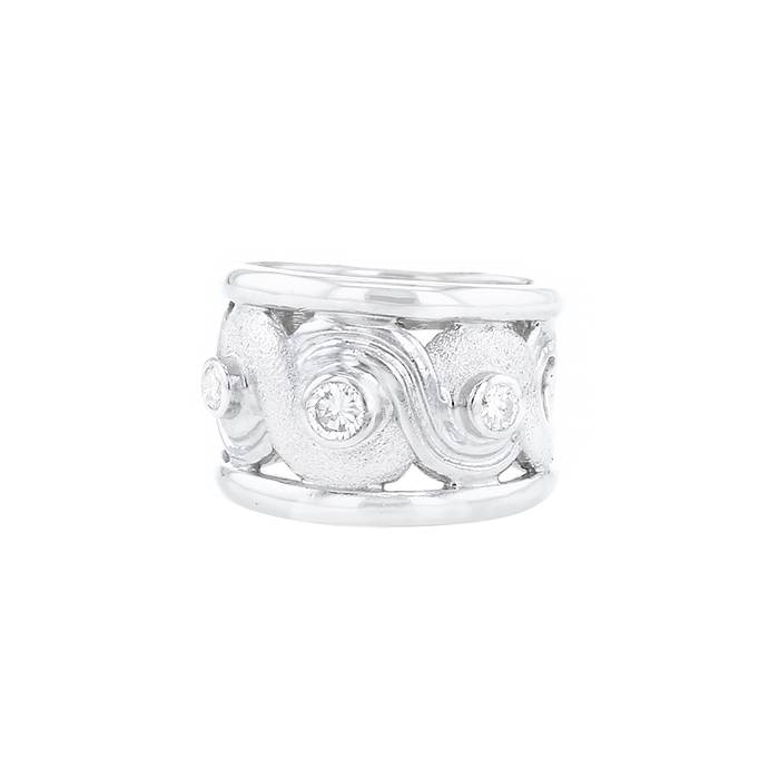 Muy bonita sortija Lalaounis de oro blanco y diamantes, compuesta de una ancha cinta calada de oro blanco, adornada de 3 diamantes de talla brillante pesando de aproximadamente 0.35 quilate, realzada de un delgado borde liso de oro blanco.