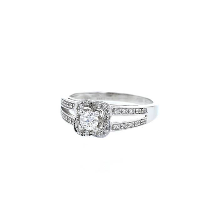 Sortija Mauboussin Chance Of Love de oro blanco y diamantes, en la cual figura una elegante flor cuadrilobulada delicadamente pavimentada de diamantes de talla brillante 0.10 quilate de de aproximadamente, que sujeta en el centro un bonito diamante de talla brillante pesando en total 0.20 quilate, realzada de un anillo calado parcialmente engastado de diamantes de talla brillante 0,10ct.