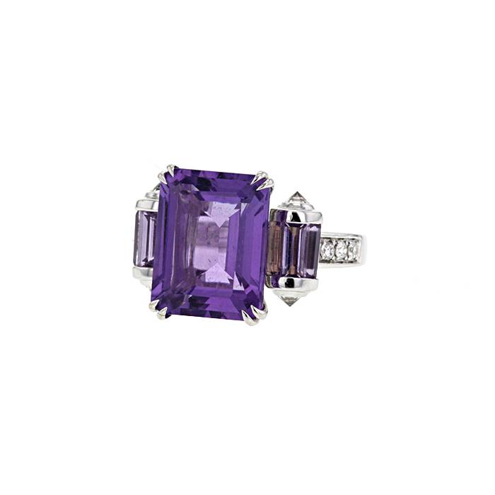 Magnífica sortija de la colección "Couleur Baiser" de oro blanco, de diamantes y de amatistas rosas, elegantemente engastada de una amatista violeta de talla esmeralda de aproximadamente 6 quilates, adornada en la parte lateral de 2 magníficos rollos de amatistas rosas realzados de 4 diamantes piriforme, realzada de un precioso engaste parcialmente engastado de diamantes de talla brillante.