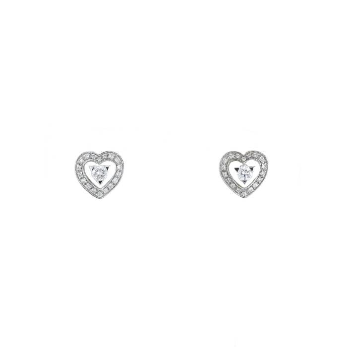 Pendientes Mauboussin Sex Love Touch de oro blanco y diamantes, en el cual figura 2 encantadores corazones calados de oro blanco delicadamente pavimentados de diamantes de talla brillante 0.30 quilate de de aproximadamente, realzados en el centro de un pequeño diamante de talla brillante de aproximadamente 0.10 quilate.