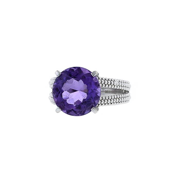 Bonita sortija Mauboussin de oro blanco, de amatista y de diamantes, compuesta de un engaste adornado con perlas de oro blanco, adornada en el centro de una amatista de talla redonda, realzada en la parte lateral de pequeños diamantes de talla brillante.