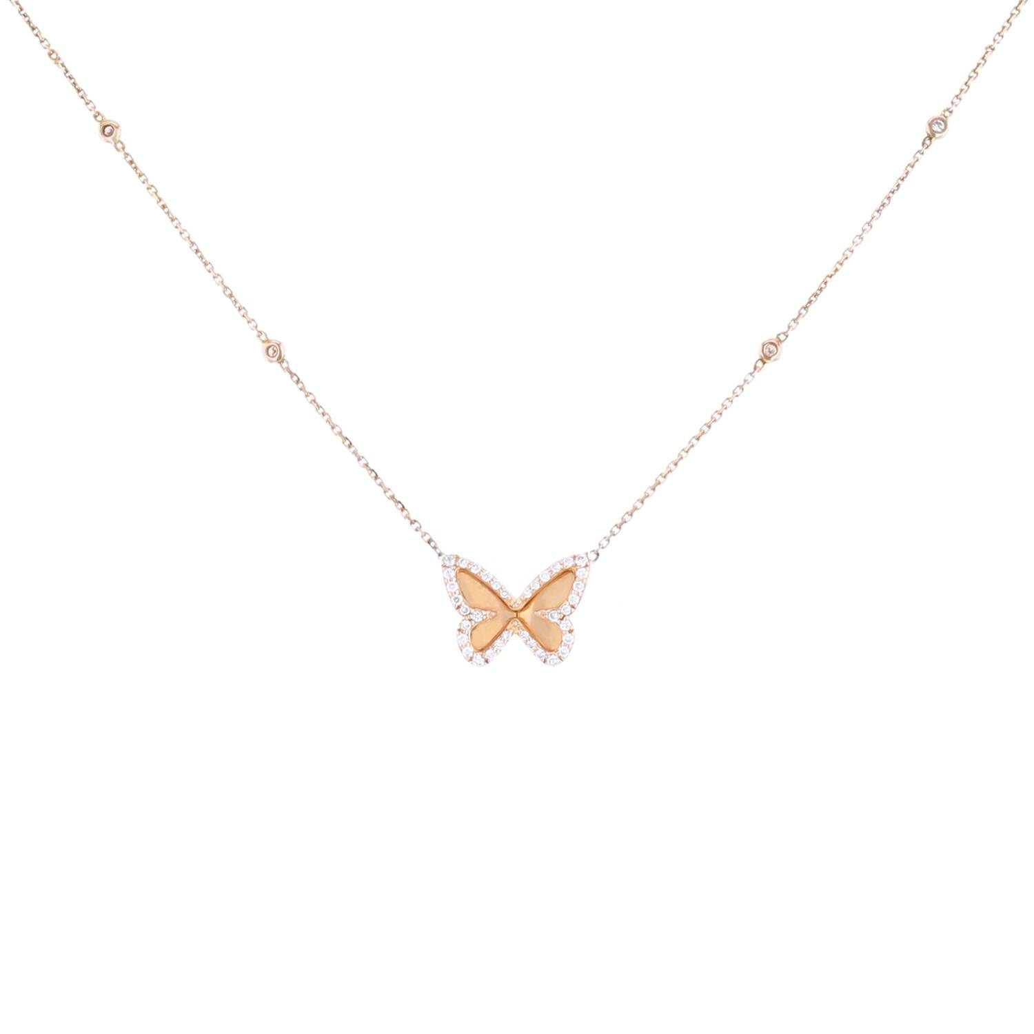 Collar Messika Butterfly Garden de oro rosa y diamantes, en el cual figura un preciosa mariposa de oro rosa, adornado en los bordes de un engaste de diamantes de talla brillante pesando en total 0.23 quilate, realzado en la cadena de pequeños diamantes finamente engastados cerrados.