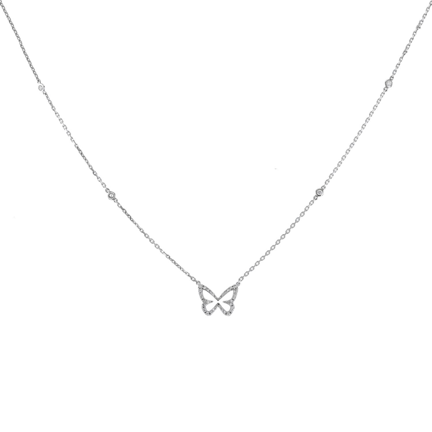 Collar Messika Butterfly modelo pequeño de oro blanco y diamantes, que forma un preciosa mariposa calada de oro blanco finamente engastada de diamantes de talla brillante 0.16 quilate de en total, rodeado de 4 delicados diamantes de talla brillante engastados cerrados, sujetado por una delgada cadena de eslabones encadenados de oro blanco.