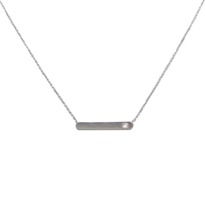 Delicado collar de oro blanco, engastado de un diamante de talla brillante aproximadamente 0.10 quilate, compuesto de una encantadora placa grabada My First, sujetado por una delgada cadena de oro blanco.