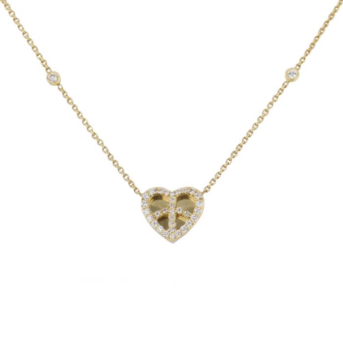 Encantador collar de la colección "Peace & Love" de oro amarillo y diamantes, adornado de un elegante corazón enteramente engastado de diamantes de talla brillante realzado del símbolo Peace & Love, sujetado por una delicada cadena de oro amarillo.
