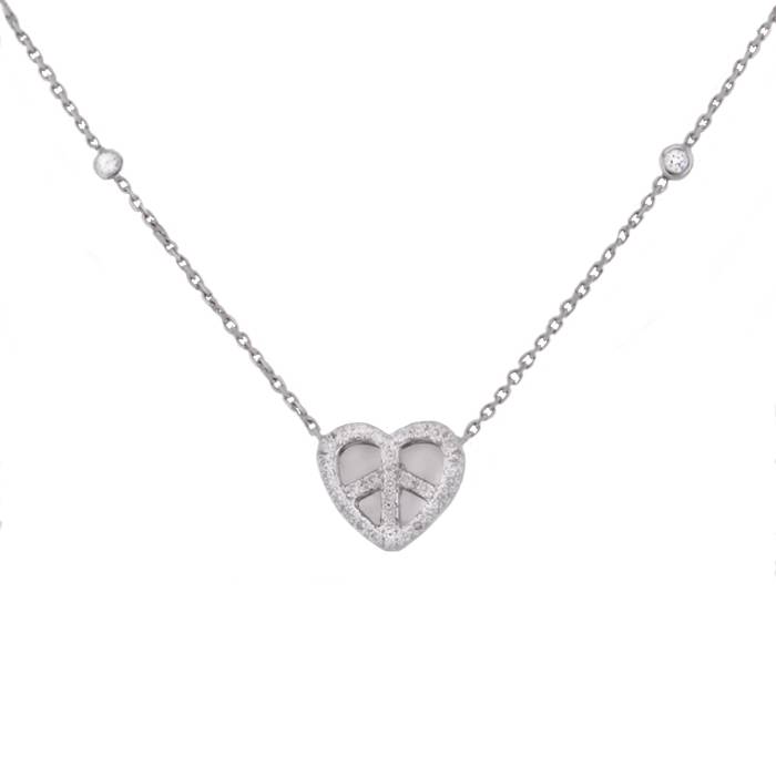Encantador collar de la colección "Peace & Love" de oro blanco y diamantes, adornado de un elegante corazón enteramente engastado de diamantes de talla brillante realzado del símbolo Peace & Love, sujetado por una delicada cadena de oro blanco.