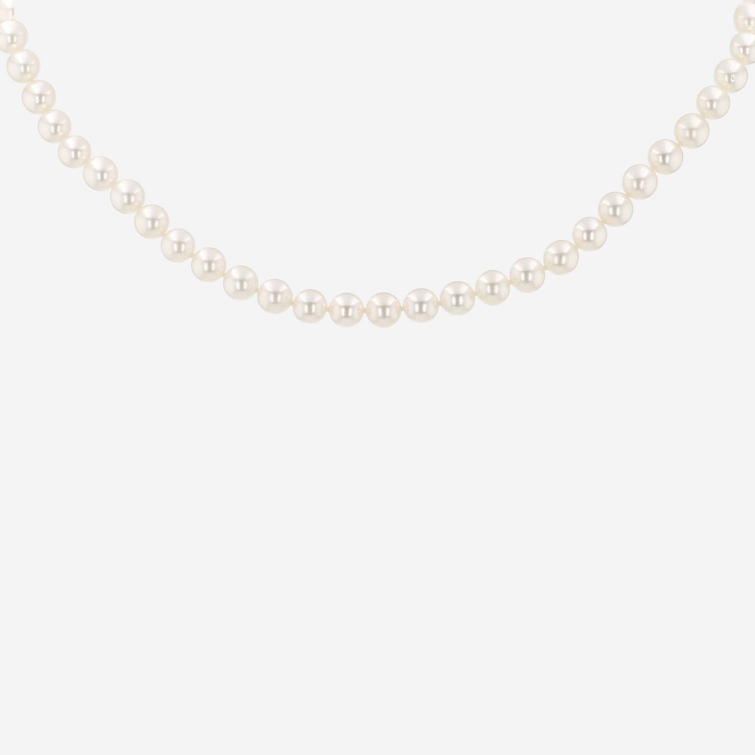 Collar Mikimoto de oro blanco 14k y perlas cultivadas de Akoya, compuesto de una sucesión de delicadas perlas cultivadas de Akoya, realzado de un precioso cierre clip calado de oro blanco 14k engastado de una perla cultivada.