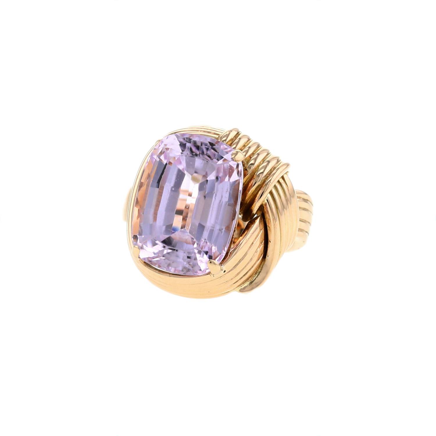 Magnífica sortija Mikimoto de oro amarillo de 14 quilates y kunzite, compuesta de una importante kunzite de talla cojín de aproximadamente 2.62 quilated, rodeada de un precioso nodo gallonado de oro amarillo de 14 quilates.