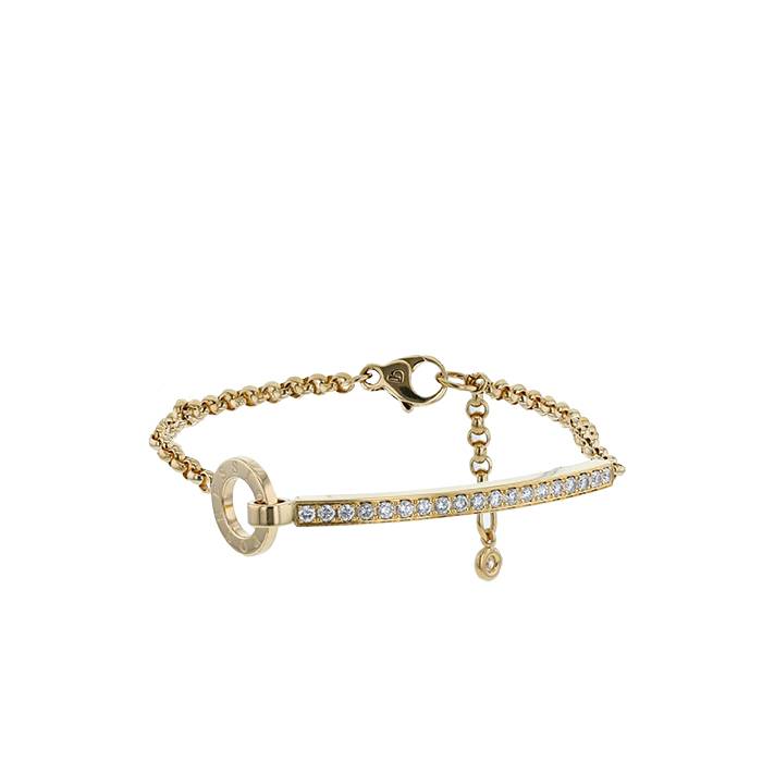 Brazalete Piaget Possession de oro amarillo y diamantes, compuesto de un diseño rectangular abombado de oro amarillo delicadamente engastado de diamantes de talla brillante 0.58 quilate de de aproximadamente, realzado en la parte lateral de un anillo grabado "Possession", todo ello sujetado por una cadena de oro amarillo.