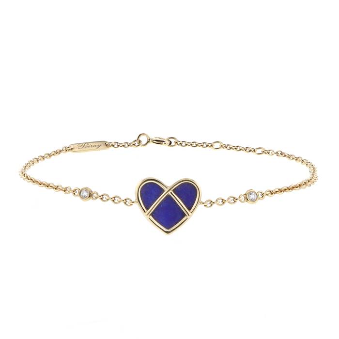 Encantador brazalete Poiray L'Attrape Coeur de oro amarillo, de lapislázuli y de diamantes, compuesto de un precioso corazón de lapislázuli, adornado de 2 bonitas tiras cruzadas de oro amarillo, rodeado de una bonita cadena de oro amarillo delicadamente engastada de 2 diamantes de talla brillante.