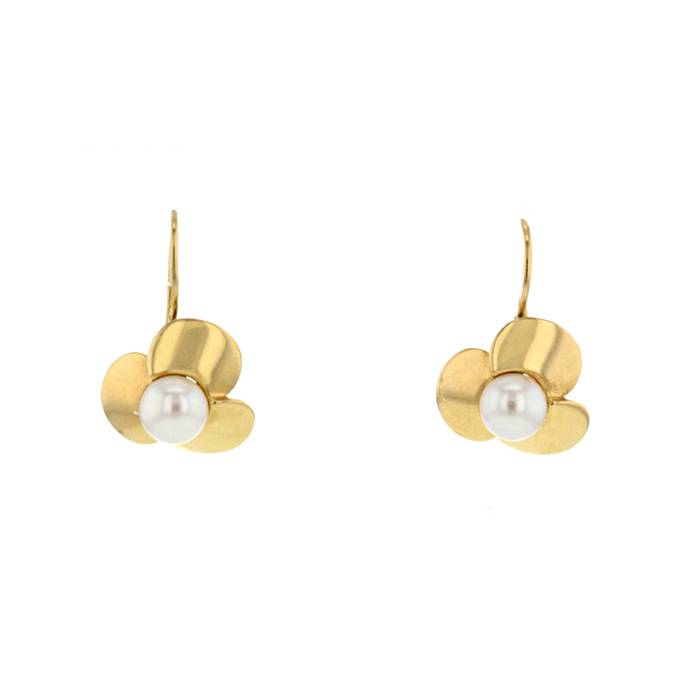 Delicados pendientes colgantes de la colección "Pétale" de oro amarillo y perlas, en los cuales figura una preciosa flor geométrica, adornados en el centro de una elegante perla cultivada.