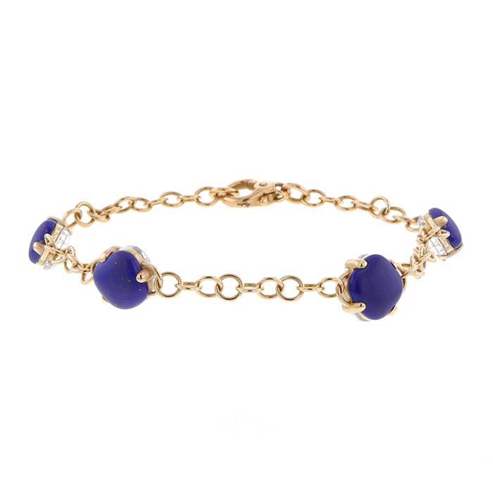 Precioso brazalete Pomellato Capri de oro amarillo, de lapislázuli y de cuarzo, compuesto de una alternancia de bonitos cabujones facetados de lapislázuli, de cuarzo, sujetado por una bonita cadena de oro amarillo.