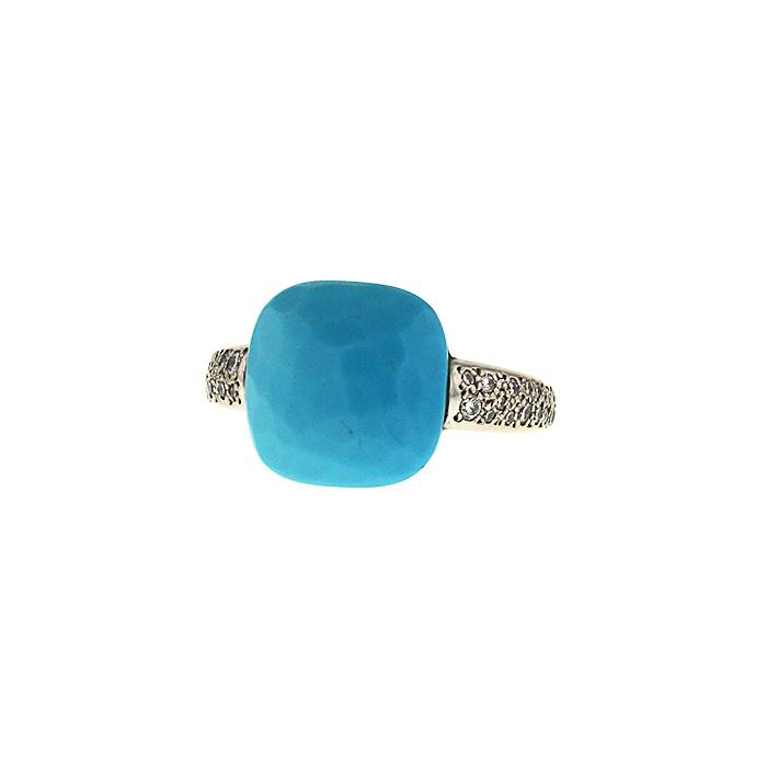 Preciosa sortija Pomellato Capri de oro blanco, de turquesa y de diamantes, compuesta de un bonito engaste de oro blanco delicadamente engastado de diamantes de talla brillante, adornada en el centro de un bonito cabujón facetado de turquesa.