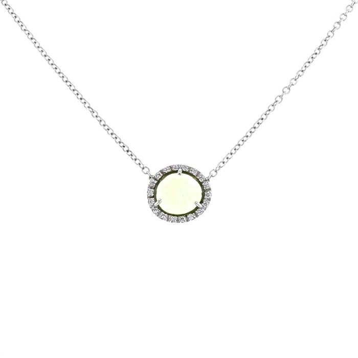 Collar Pomellato Colpo Di Fulmine de oro blanco, de peridoto, y en diamantes, compuesto de una delicado engaste ovalado de oro blanco delicadamente engastado de diamantes de talla brillante, adornado en el centro de un muy bonito peridoto facetado, todo ello sujetado por una cadena de oro blanco.