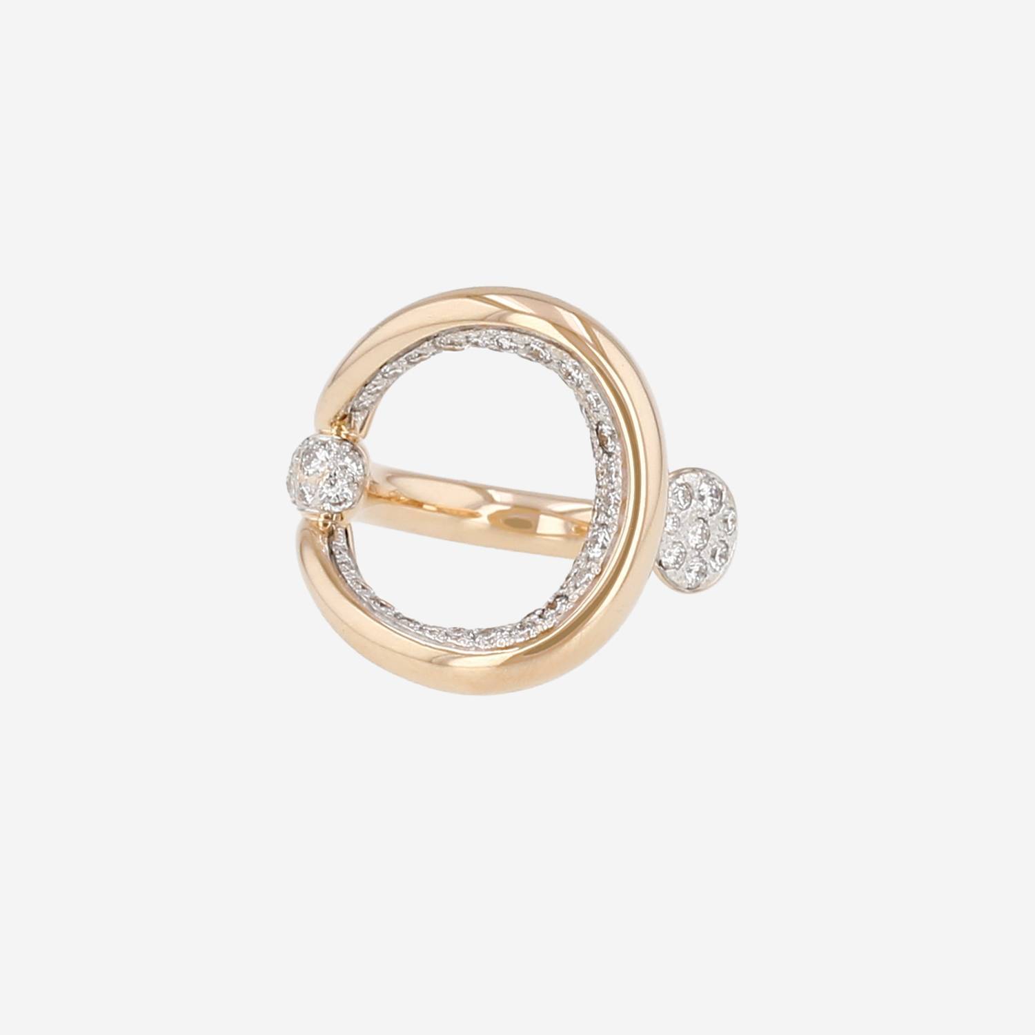 Sortija Pomellato Fantina de oro rosa, de oro blanco, y en diamantes, compuesta de una importante engaste ondulado calado de oro rosa, adornada de muy bonitos diamantes de talla brillante pesando en total 1 quilate delicadamente engastados en oro blanco.