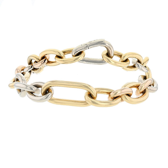 Brazalete Pomellato Iconica de oro amarillo, de oro rosa, y en oro blanco, compuesto de una alternancia de importantes eslabones ovalados de oro amarillo, de oro rosa y en oro blanco.