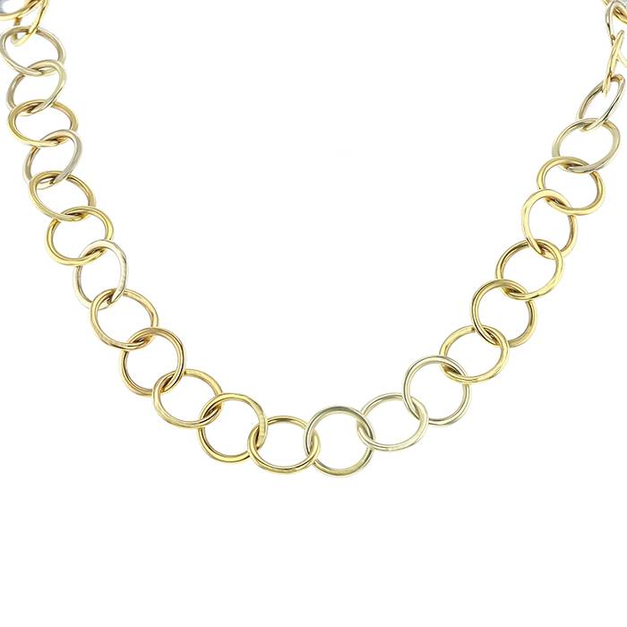 Precioso collar Pomellato Lucciole de oro amarillo, de oro blanco y de diamante, compuesto de una alternancia de delgados anillos abombados de oro amarillo, de oro blanco, adornado en el cierre de un precioso pequeño diamante de talla brillante.