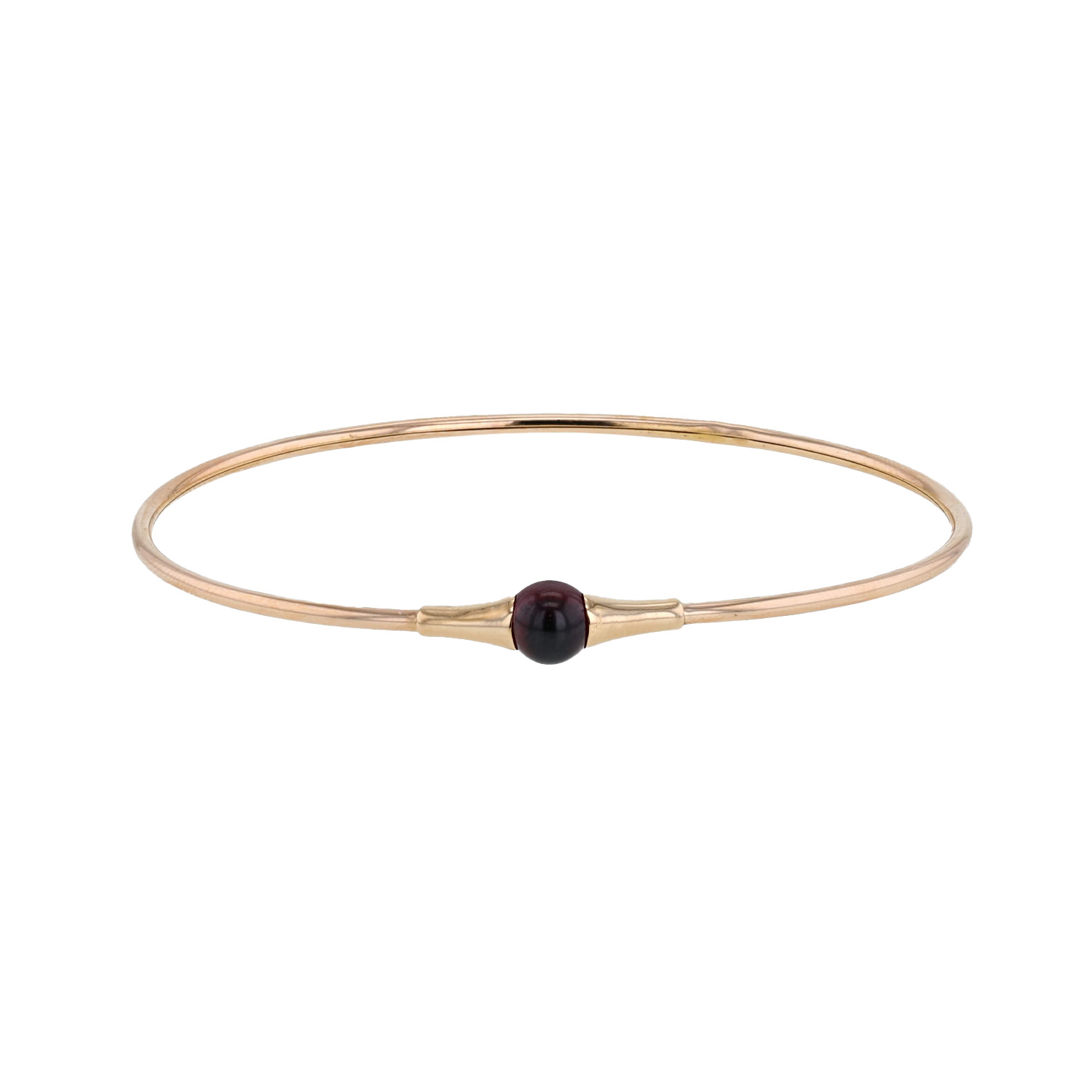 Precioso brazalete Pomellato M'ama Non M'ama de oro rosa y granate, compuesto de un delgado anillo semirrígido de oro rosa, realzado en el cierre de un bonito cabujón de granate.